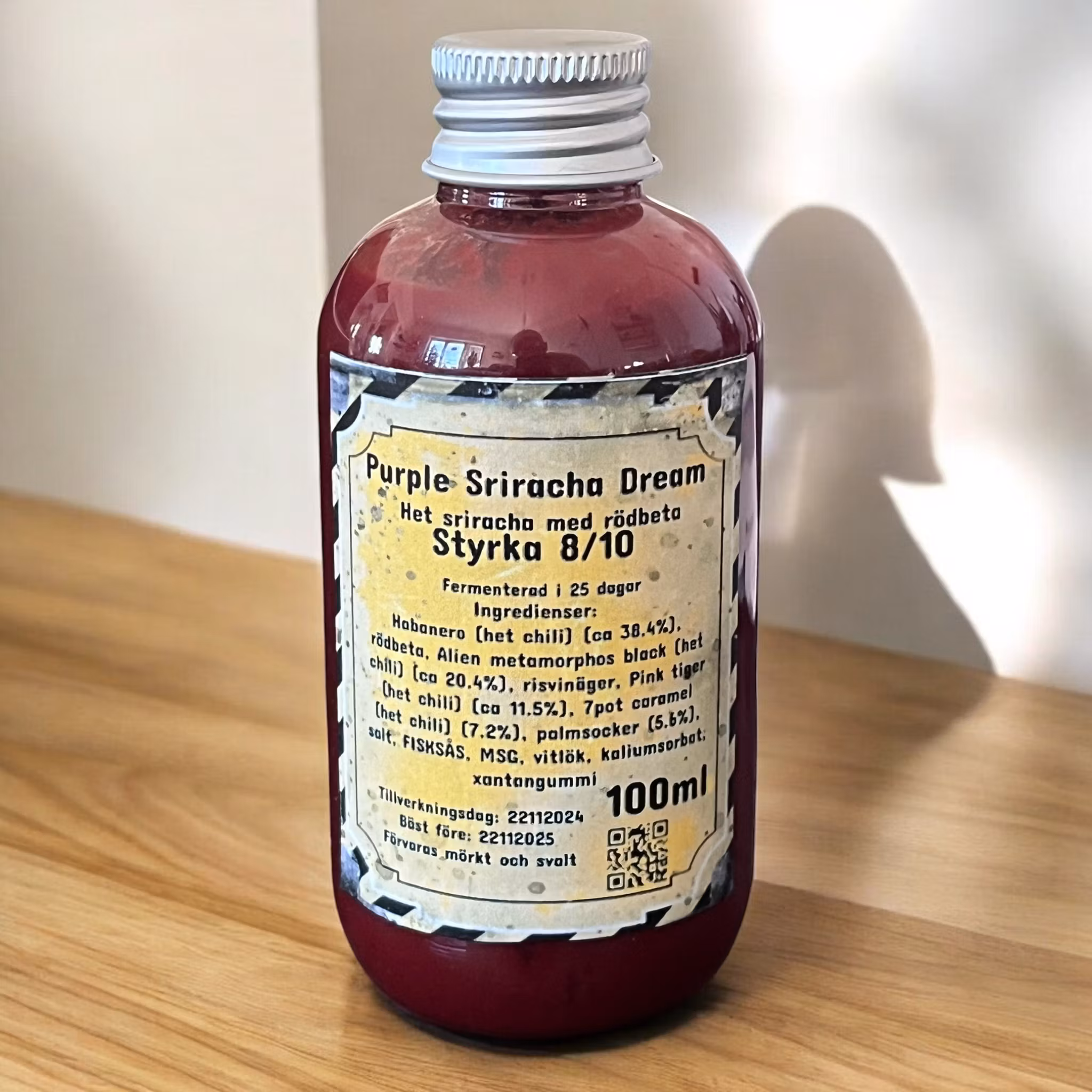 Förpackningen på 100 ml klämflaska gör det enkelt att dosera och applicera precis rätt mängd av denna smakfulla sås. Byt ut din vanliga sriracha mot denna spännande variant, och låt varje måltid bli en oförglömlig upplevelse. Perfekt för att krydda allt från tacos och nudlar till grillade grönsaker och marinader. Purple Sriracha Dream är mer än bara en sås; det är en smakresa du inte vill missa!