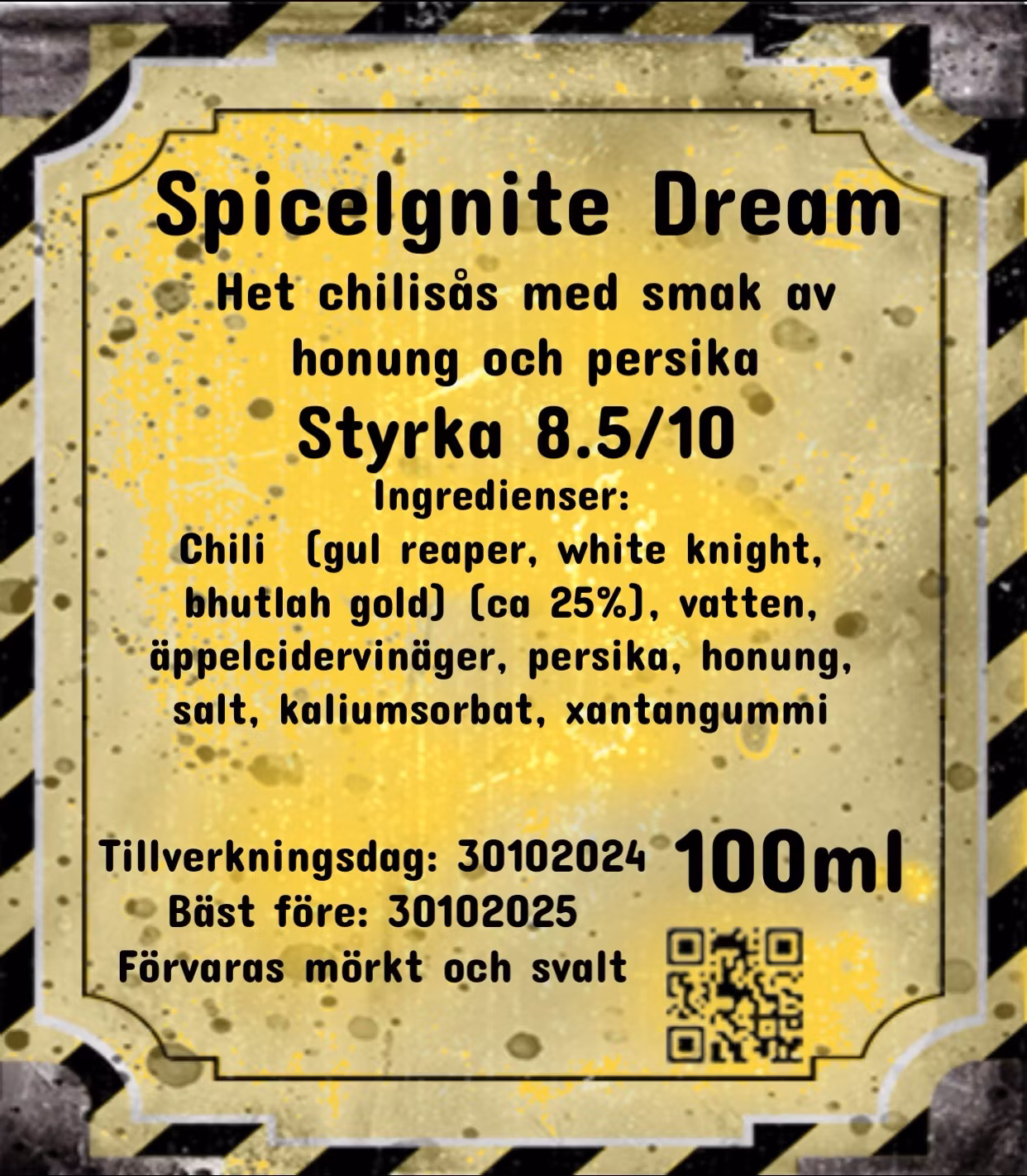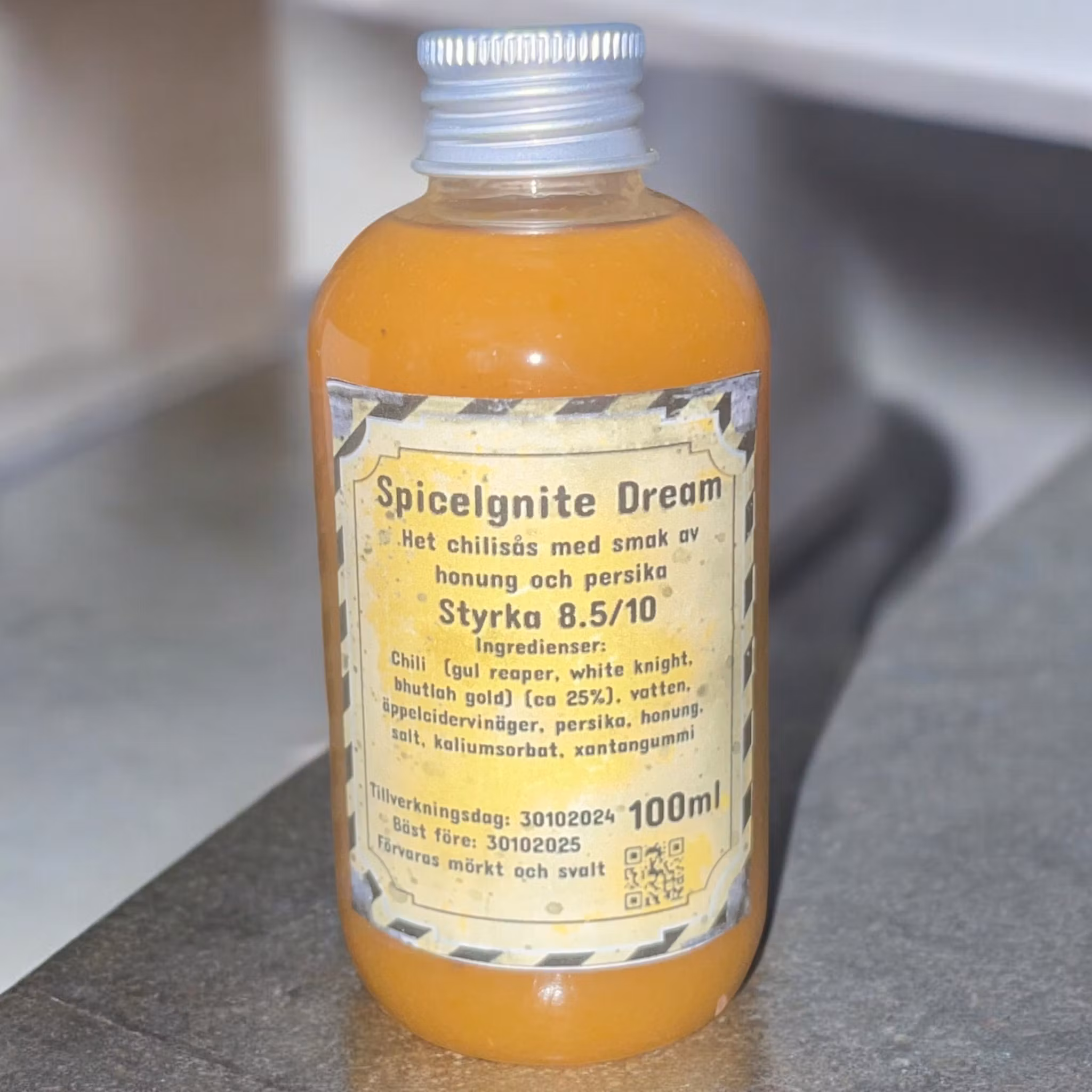Chili (gul reaper, white knight, bhutlah gold) (ca 25%), vatten, äppelcidervinäger, persika, honung, salt, kaliumsorbat, xantangummi